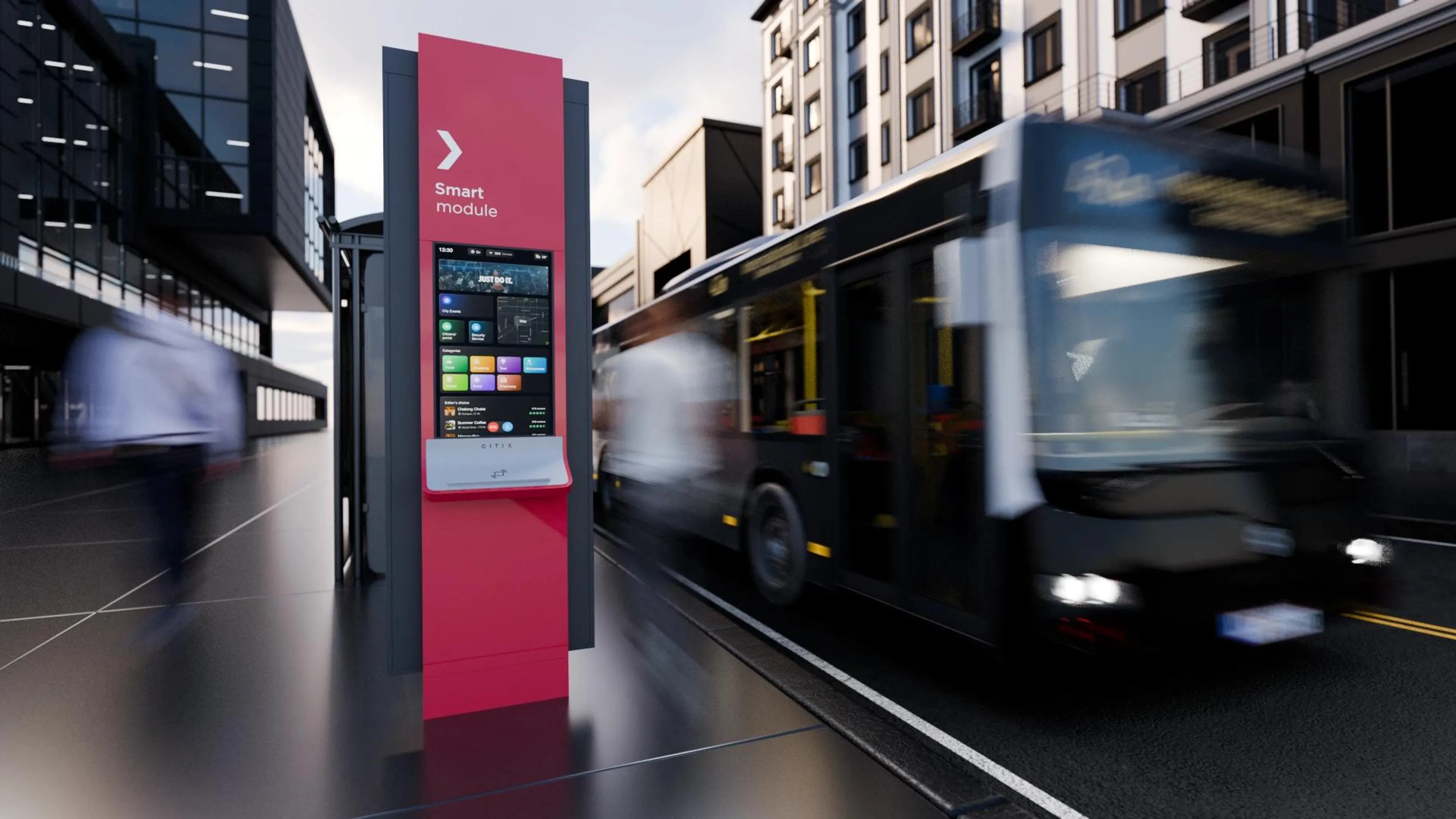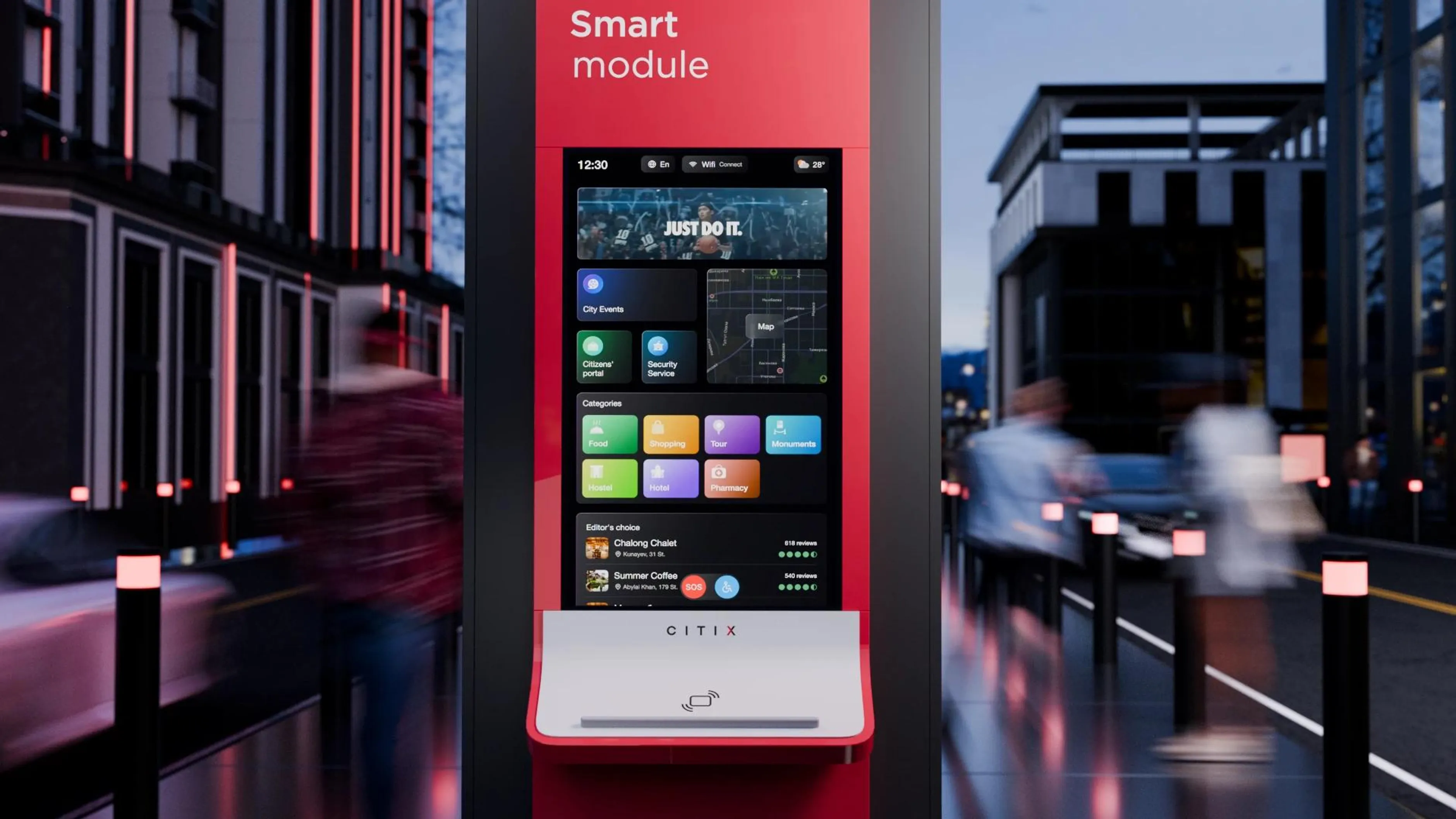We've developed a smartboard with a complete selection of useful information for citizens and tourists, free Wi-Fi, wireless charging, and NFC Module for payments, which also serves as an oasis of a safe urban environment.